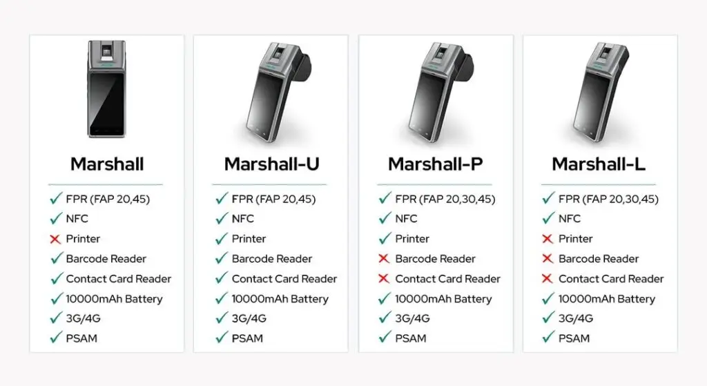 Marshall 5 là thiết bị sinh trắc học cầm tay 5″ tích hợp nhiều công nghệ hiện đại: cảm biến vân tay chuẩn FBI (FAP 20/30/45), nhận diện khuôn mặt 13 MP, đầu đọc NFC/smart‑card, quét mã vạch và máy in nhiệt 2″. Thiết bị hỗ trợ đầy đủ quy trình di động như đăng ký cử tri, dịch vụ tài chính, kiểm soát biên giới,… mang lại hiệu suất cao trong môi trường thực địa.